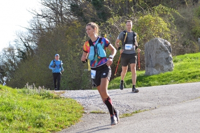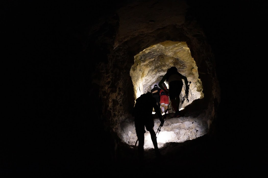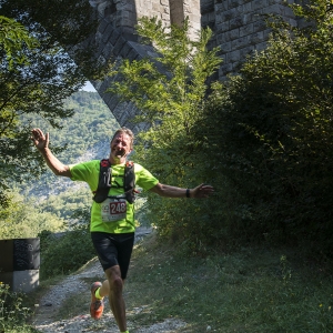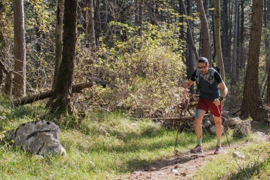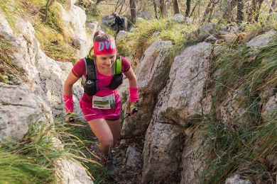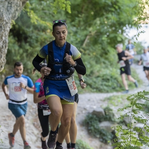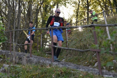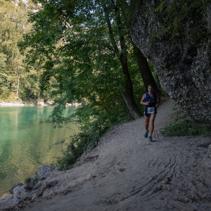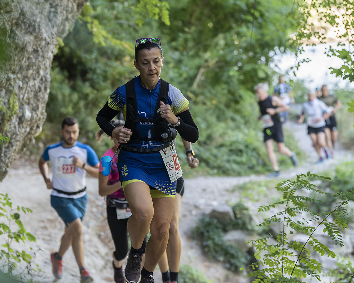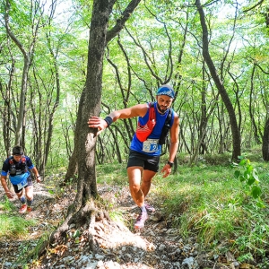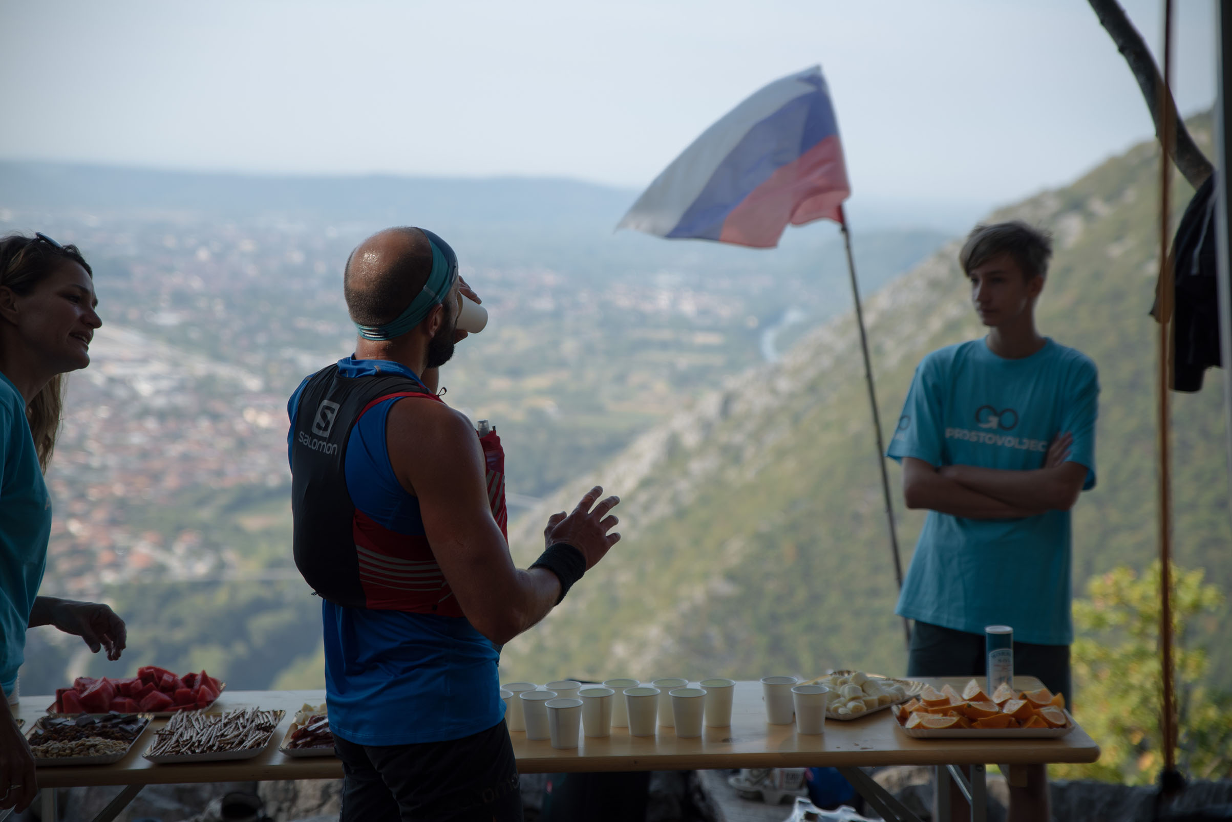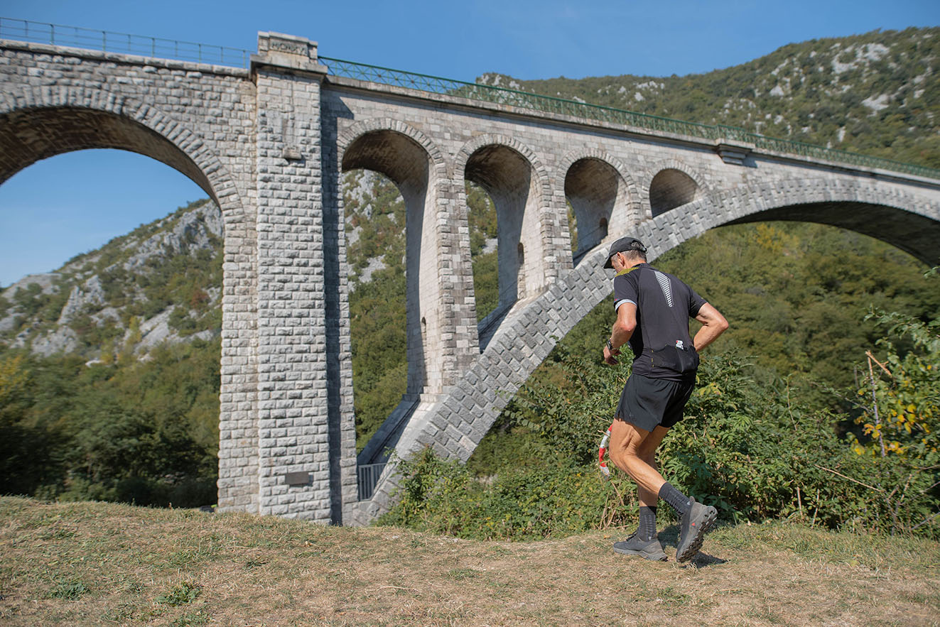 After the river crossing, the course follows a short uphill section to the cycling path leading towards Kanal ob Soči. After 2.5 km of asphalt, the route turns left onto a steep trail toward war tunnels on Sabotin. A demanding ascent follows, leading past historic bunkers to the Sabotin mountain hut, the third aid station. The course continues along the ridge to the Sabotin summit (609 m a.s.l.), offering panoramic views. The descent follows a rocky path to St. Valentine’s ruins, then past the "TITO" stone inscription, before a technical zig-zag descent into the valley.
