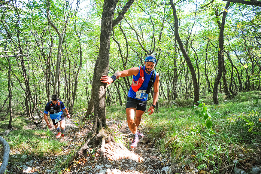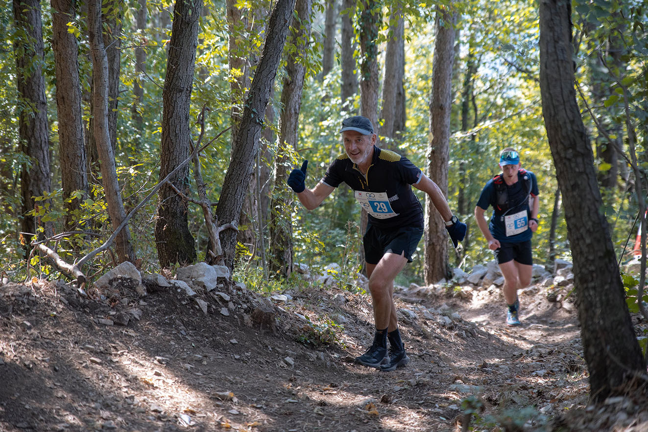 From the summit, the route follows an undulating ridge, featuring rocky terrain that demands good technique. The descent leads to the Nova Gorica – Lokve road (Prevala), where runners cross a roundabout and start climbing towards the Sveta Gora peak. After 300 meters of asphalt, the trail merges with an MTB path, leading to Belvedere, a scenic viewpoint and the second aid station.